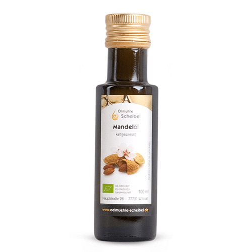 Bio-Mandelöl aus der Ölmühle Scheibel wird aus süßen Mandeln schonend kalt gepresst.